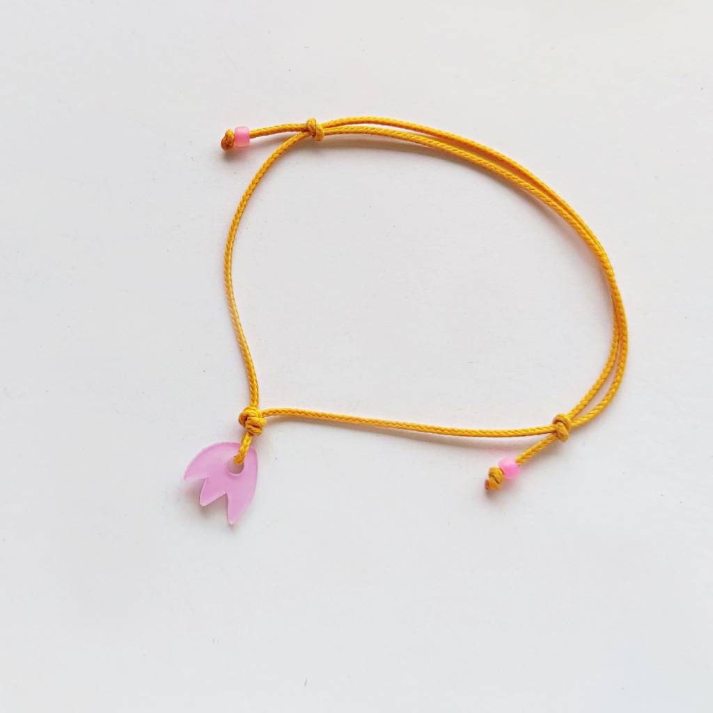 Efektowny, nowoczesny, a zarazem romantyczny dodatek. KWIAT to uroczy i delikatny wzór. Bransoletka wykonana jest z: tworzywo sztuczne, ozdobny sznurek, szklane koraliki. Długość zawieszki – ok. 1 cm. Szerokość zawieszki – ok. 1cm. Istnieje możliwośc wykonania bransoletki w innej kolorystyce i kształcie zawieszki.