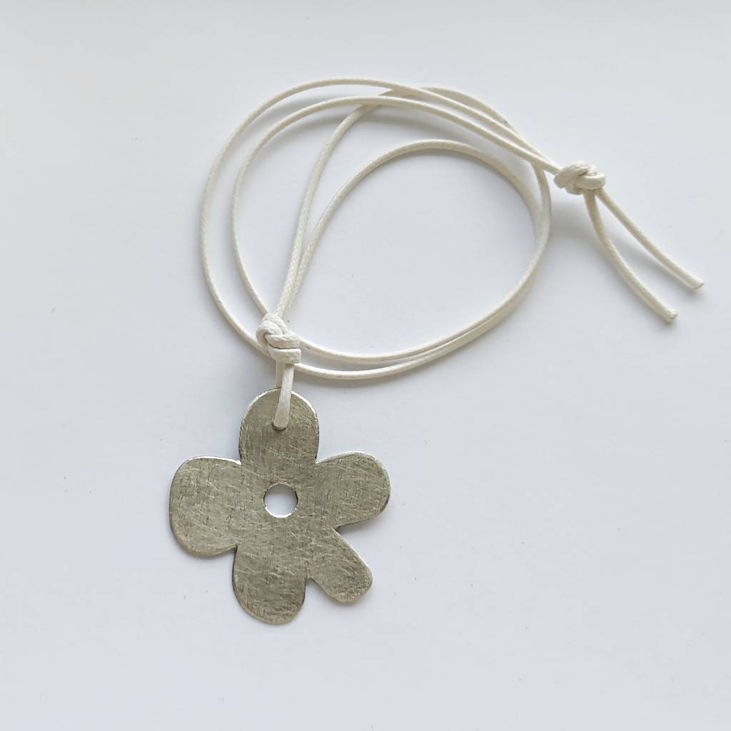 Efektowny, nowoczesny, a zarazem romantyczny dodatek. KWIAT to uroczy i delikatny wzór. W wyjątkowy sposób łączy on ażur z metalem, który przyciąga wzrok jak mało która ozdoba. Wisiorek wykonany jest z -alpaki, ozdobny sznurek. Alpaka : zmatowiona. Długość sznurka – 70 cm. Długość zawieszki – 4,5cm. Szerokość zawieszki – 4, 3cm.