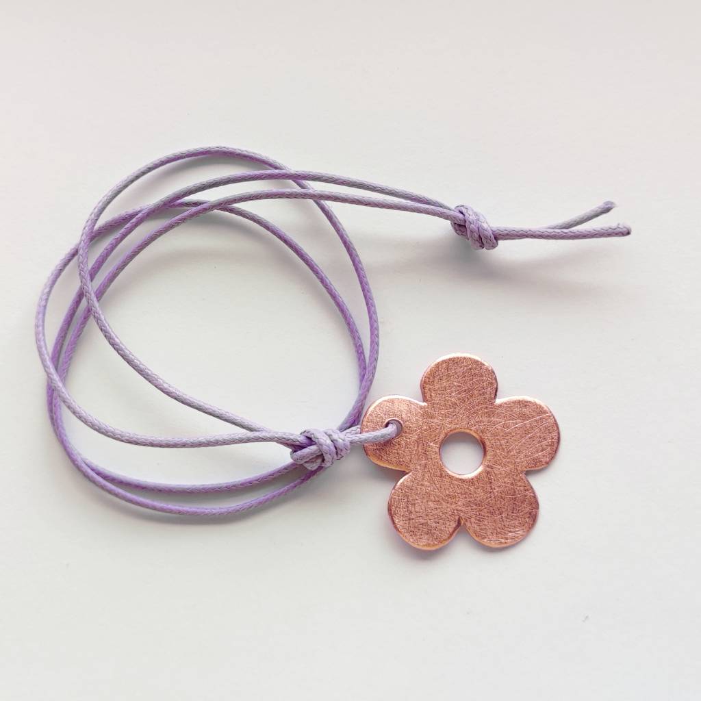 Efektowny, nowoczesny, a zarazem romantyczny dodatek. KWIAT to uroczy i delikatny wzór. W wyjątkowy sposób łączy on ażur z metalem, który przyciąga wzrok jak mało która ozdoba. Wisiorek wykonany jest z -miedź, ozdobny sznurek. Miedź: zmatowiona. Długość sznurka – 70 cm. Długość zawieszki – 3,5cm. Szerokość zawieszki – 3,5 cm.