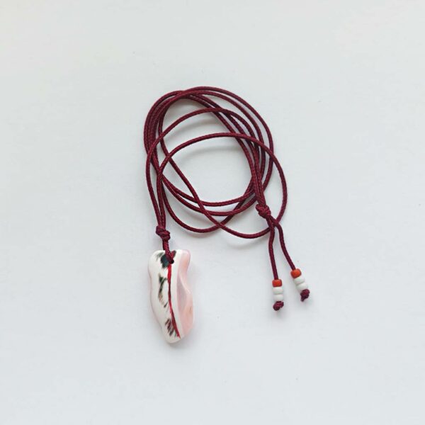 Masa perłowa– zabawny dodatek. Ciekawy dodatek przykuwają uwagę i zaskakuje wzornictwem. Taki wisiorek sprawi, że każda stylizacja nabierze niepowtarzalnego, fantazyjnego charakteru. Wisiorek wykonana jest z masa perłowa 2,5 – 1,3 cm, ozdobny sznurek, szklane koraliki/