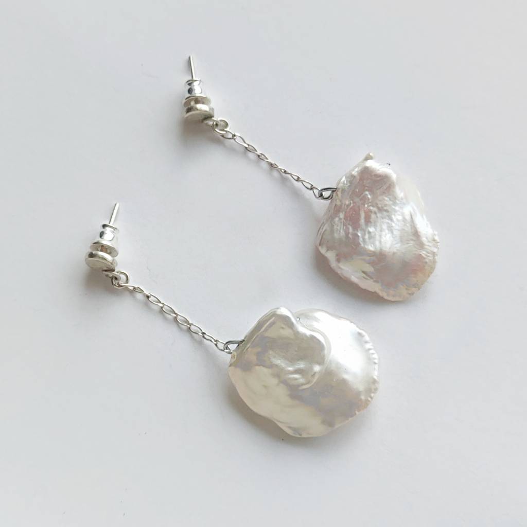 Oryginalność i prostota. OKRĄG – kształt doskonały. Kolekcję cechuje elegancja i prostota jak również ekstrawagancja i indywidualizm. Kolczyki na sztyftach wykonane są z : srebro, Perła słodkowodna biała płatki 10-14 mm .Srebro – próby 0,925, zmatowione, . Długość kolczyków – ok. 6 cm