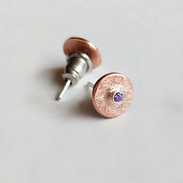 Oryginalność i prostota. OKRĄG – kształt doskonały. Kolekcję cechuje elegancja i prostota jak również ekstrawagancja i indywidualizm. Kolczyki na sztyftach wykonane są z : miedź, ametyst Srebro – próby 0,925, miedź – zmatowiony. Średnica kolczyka – 0,7 cm