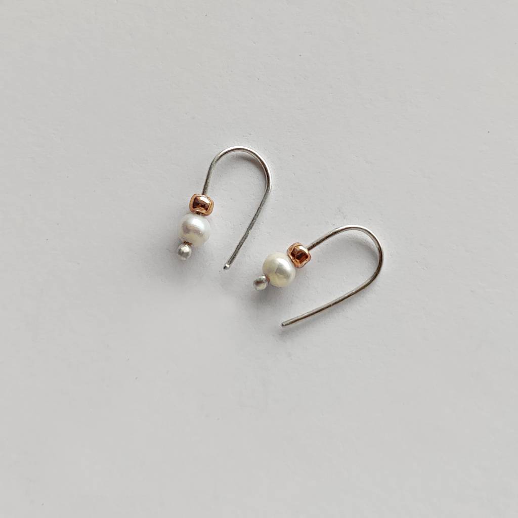 Oryginalność i prostota. OKRĄG – kształt doskonały. Kolekcję cechuje elegancja i prostota jak również ekstrawagancja i indywidualizm. Kolczyki wykonane są z – srebro, Perła słodkowodna srebrna oponka 4 mm, koraliki szklane. Srebro – zmatowione. Długość ok. 1,7 cm.