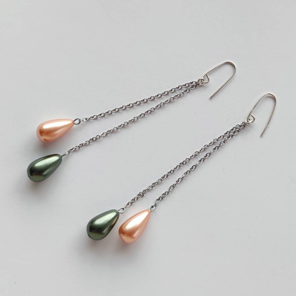 Oryginalność i prostota. OKRĄG – kształt doskonały. Kolekcję cechuje elegancja i prostota jak również ekstrawagancja i indywidualizm. Kolczyki wykonane są ze srebro, perła seashell kropla zielona 14×9 mm, stal chirurgiczna . Srebro – próby 0,925, zmatowione. Długość kolczyków – ok. 9cm.