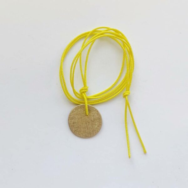 Oryginalność i prostota. Kolekcję cechuje elegancja i prostota jak również ekstrawagancja i indywidualizm. Wisiorek wykonany z: mosiądz ozdobny sznurek. Średnica zawieszki 1,8 cm. Długość sznurka- ok. 60 cm