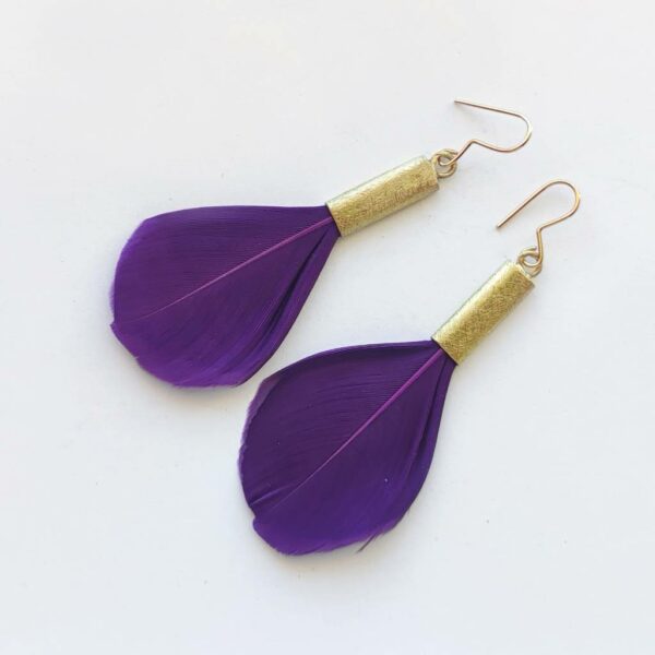 PIÓRKO – stylowy dodatek. Połączenie lekkości piórka i trwałości metalu. Metal niezwykle kontrastuje z naturalnym barwionym puchem. Kolczyki wykonane są z mosiądz, naturalnie barwione pióra. Mosiądz – zmatowiony. Bigle otwarte – srebro pr.925 pozłacane. Długość z biglami – 7 cm.