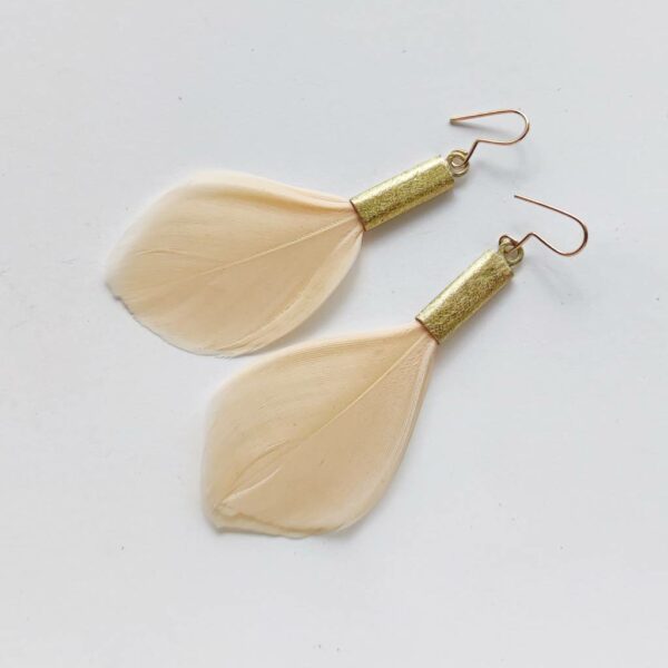 PIÓRKO – stylowy dodatek. Połączenie lekkości piórka i trwałości metalu. Metal niezwykle kontrastuje z naturalnym barwionym puchem. Kolczyki wykonane są z mosiądz, naturalnie barwione pióra. Mosiądz – zmatowiony. Bigle otwarte – srebro pr.925 pozłacane. Długość z biglami – 7 cm.