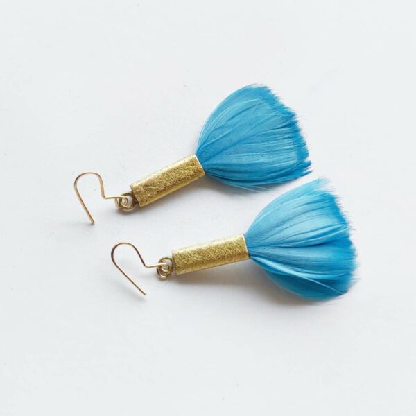 PIÓRKO – stylowy dodatek. Połączenie lekkości piórka i trwałości metalu. Metal niezwykle kontrastuje z naturalnym barwionym puchem. Kolczyki wykonane są z mosiądz, naturalnie barwione pióra. Mosiądz – zmatowiony. Bigle otwarte – srebro pr.925 pozłacane. Długość z biglami – 7 cm.
