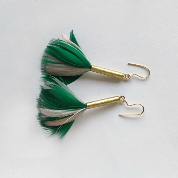 PIÓRKO – stylowy dodatek. Połączenie lekkości piórka i trwałości metalu. Metal niezwykle kontrastuje z naturalnym barwionym puchem. Kolczyki wykonane są z mosiądz, naturalnie barwione pióra. Mosiądz – zmatowiony. Bigle otwarte – srebro pr.925 pozłacane. Długość z biglami – 7 cm.