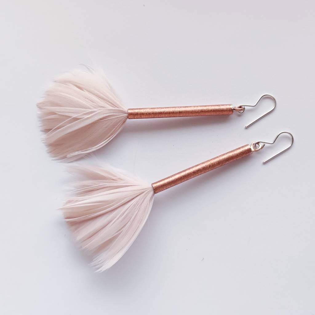PIÓRKO – stylowy dodatek. Połączenie lekkości piórka i trwałości metalu. Metal niezwykle kontrastuje z naturalnym barwionym puchem. Kolczyki wykonane są z : miedź, naturalne barwione pióra. Miedź : zmatowiona. Bigle otwarte – srebro pr.925. Długość z biglami – 8 cm