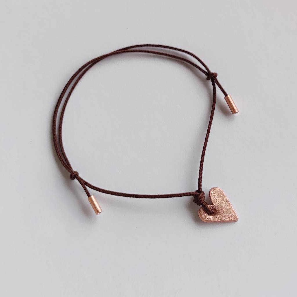 Serduszko bransoletka – uroczy dodatek . Idealna dla kobiet ceniące ładną oraz oryginalna biżuterii. Bransoletka wykonana jest z: miedź, ozdobny sznurek. Miedź – zmatowiony. Długość zawieszki – ok 1 cm. Szerokość zawieszki – 1cm